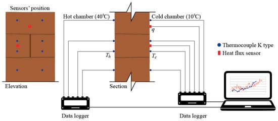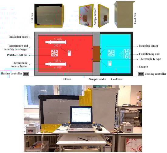 This study followed the adapted hot box technique [59] (Figure 6), which is a reliable and accurate method for measuring thermal transmittance in laboratory experiments [62,63,64,65]. In this method, heat flux between hot and cold chambers was estimated using heat flux sensors. The hot chamber (800 mm × 600 mm × 650 mm) was made of commercially available 50 mm thick polyisocyanurate insulation boards (PIR, λ = 0.022 W/mK, R = 2.25 m²K/W), which have a thin aluminium foil covering on both sides to keep them isolated from the outside environment. The λ value of this insulation material is comparable to polystyrene foam (0.035 W/mK) [62], expanded polystyrene (0.034 W/mK) [63], and foam polyurethane (0.0245 W/mK) [66], which were used in previous studies to build the hot chamber. Two thermostatic tubular heaters (DIMPLEX ECOT1FT 40 W, 230–240 V) were placed inside the hot chamber as an internal heat source. On the other hand, the cold chamber (450 mm × 600 mm × 750 mm) was a refrigerator used to cool the inside air. The temperatures of the hot and cold chambers were controlled by the EMKO ESM-3711-H temperature controller. The sample wall was positioned between the hot and cold chambers in a sample holder made of double insulation boards (100 mm). Additionally, any gaps between the wall and the sample holder were filled with insulation material (polyisocyanurate insulation, λ = 0.022 W/mK, R = 2.25 m²K/W) and then sealed with aluminium foil tape to ensure that heat propagation could only occur through the exposed wall surfaces. Furthermore, inside both chambers, a small fan was placed to prevent any thermal stratification and to ensure uniform heating and cooling [63].
