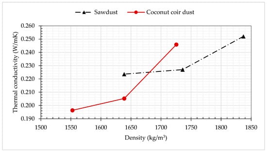 - The presence of more waste content in the mixture decreased the density and consequently lowered the thermal conductivity of the samples. Based on the fact that coconut coir dust particles are lighter than sawdust particles, samples reinforced with coconut coir dust provided better thermal insulation than those reinforced with sawdust. When compared to the reference sample, the addition of coconut coir dust and sawdust resulted in a decrease of about 26% and 22% in density, as well as 46% and 43% in thermal conductivity, respectively.