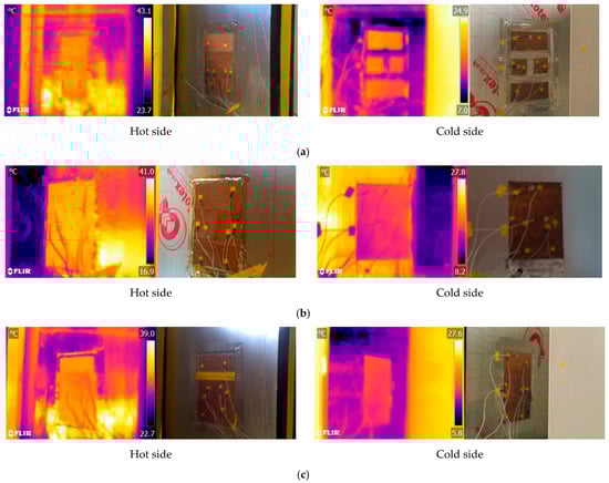 Thermographs of different wall surfaces: (a) reference wall; (b) sawdust wall; (c) coconut coir dust wall.