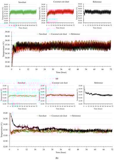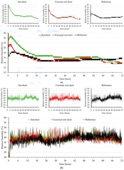Relative humidity (72 h): (a) hot chamber; (b) cold chamber.