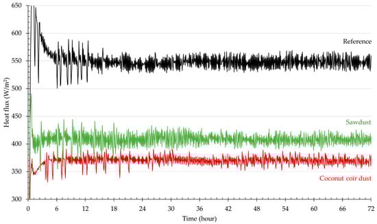 Table 6 lists the results of the last 24 h of the different wall sample test. The heat flux measured through the walls exhibited a similar pattern (Figure 12), but with different magnitudes. The reference wall had the highest heat flux value of 548.17 W/m2, followed by the heat flux in the sawdust wall, with a value of 407.53 W/m2, while the heat flux of the coconut coir dust wall showed the lowest value of 369.96 W/m2. The lower thermal conductivity and density of the coconut coir dust sample may contribute to the lower heat flux. Materials with a higher thermal transmittance, or U-value, lose more heat, whereas those with a lower U-value lose less heat. The results show that the coconut coir dust sample had the lowest U-value, indicating the highest thermal resistance, as thermal resistance is inversely proportional to the thermal transmittance. The thermal resistance of the coconut coir dust and sawdust sample walls increased by around 48% and 35%, respectively, as compared to the reference sample wall.