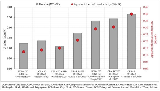 In Figure 13, the experimental U-value results of different wall constructions are compared to the findings of several studies in the literature [90,91,92,93,94]. Due to the different thicknesses of the experimented walls and since the U-value is highly dependent on the thickness of the wall, the apparent thermal conductivity values of the walls are calculated by multiplying the U-value by the thickness of the wall to obtain a better comparison of their thermal efficiency [95]. However, it should be noted that the literature thus far reflects very few conducted and published tests.