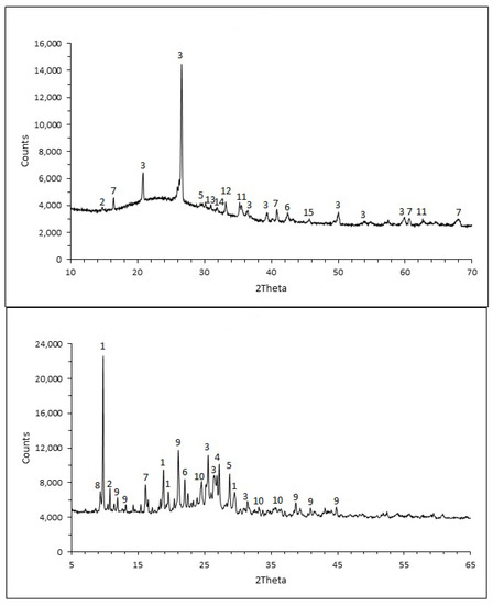 XRD patterns for Class F FA (top) and HFFA (bottom):(1) Anthracene, (2) Carbon, (3) Quartz, (4) Anglesite, (5) Calcite, (6) Goethite, (7) Mullite, (8) Ettringite, (9) Sulfur, (10) Barite, (11) Magnetite, (12) Hematite, (13) Maghemite, (14) Periclase, (15) Alumina.