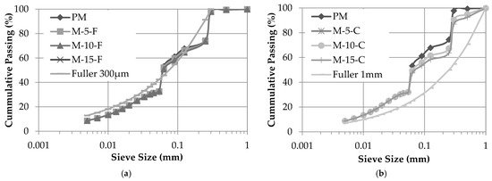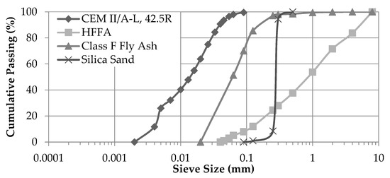 The grain size distributions of the ingredient particles of each of the seven mixtures tested in this study are compared to the optimum one in Figure 5. From this, it is observed that the mixtures (M-5-15-F) with the finer grain size (<300 μm) HFFA are closer to the ideal gradation suggested by Fuller and Thomson [44].
