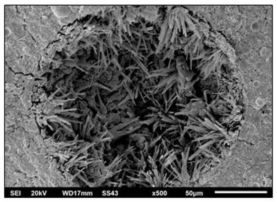 Figure 3 shows the needle-like ettringite crystals (DEF) growing in the capillary pores; the morphology of ettringite demonstrates radial growth and nucleation, resulting in intense cracking of the composites (Figure 4).