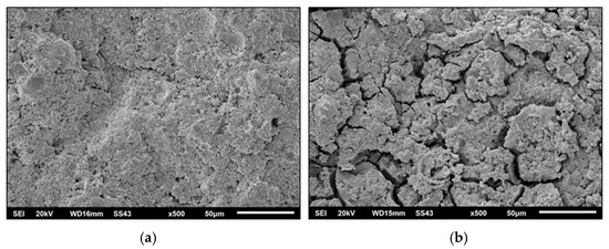 SEM images for sample M-15-F (b) and PM (a). Intense cracking in the composite mortar is observed, while the sample without the HFFA additive exhibits a dense structure with no cracks or voids.