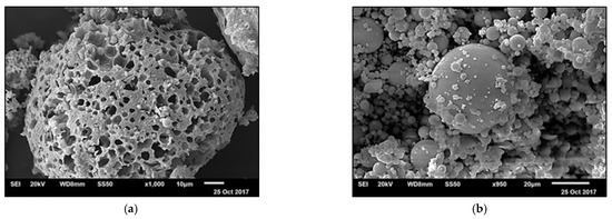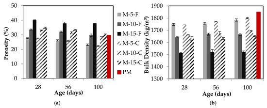 Figure 7 summarizes the open porosity and bulk density results. The values reported comprise the average of measurements on three different specimens. From the results, it is evident that the bulk density of all mix designs generally shows a tendency to increase with time from 28 to 100 days of age, whereas the open porosity follows the opposite trend, as expected. With an increasing amount of HFFA, the bulk density of the hardened composites decreases, whereas their open porosity increases. This is attributed to the fact that mixtures with a higher percentage of HFFA required higher dosages of water in order to obtain the same workability (Table 3), mainly because of the porous nature of the carbon particles included in the HFFA (Figure 8a). In contrast, Class F FA includes significant amounts of cenospheres (Figure 8b), which improve the workability of the fresh mixture. The presence of silicates in Class F FA (see also Figure 1) also enhances the water retentivity, and consequently the pumping properties, of the fresh mixture. As a result, when used with a recommended superplasticizer, Class F FA leads to a cementitious composite (e.g., PM) with reduced water demand and excellent workability (see Table 4 for the characteristics of PM in the fresh state). On the other hand, the mixture prepared without the HFFA additive has a similar porosity (ca. 30%) to the rest of the mixtures, except for M-15-F. The results are generally in line with those of other studies [51,52].
