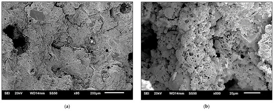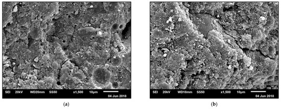 Sicakova et al. [56] investigated the water absorption of composite building materials containing fine-grained additives. These authors suggested that the fine particle size has an adverse effect on the sorptivity of both mortars and concretes, while the higher content of fine-grained material further increases the sorptivity coefficient. Fetter [57] estimated the capillary rise in sedimentary rocks with various grain fineness, showing that fine-grained rocks demonstrate higher capillary absorption than coarse-grained rocks. These findings are in line with the results reported in our study, whereby the sorptivity appears to increase with the use and percentage content of fine-grained HFFA. The higher sorptivity of the samples with the fine-grained HFFA is attributed to their microstructure (Figure 12). Samples with fine-grained HFFA have a rough and sugary texture due to the weak bonding of their grains. In contrast, samples with coarse-grained HFFA are more consistent. Furthermore, the higher the percentage content of HFFA, the more porous the microstructure of the samples studied (Figure 12).