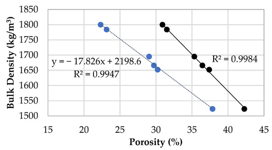 Figure 10 confirms the inverse linear relationship between the bulk density and the open porosity of the investigated composites. Using an estimate of the solid density (ρs), based on the composition of the materials under study, and the experimental bulk densities, one may also calculate the total porosities (f):