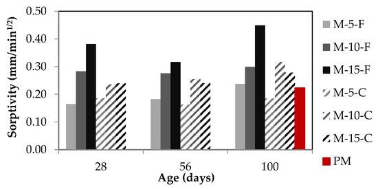 Figure 11 shows the normalized capillary absorption (sorptivity) results over time for all samples studied. The values reported again comprise the average of measurements on three different specimens. From these results, it appears that the sorptivity does not vary significantly with time, despite the fact that a general increase in value is observed from 28 to 100 days of testing. This suggests that the early development of the microstructure of cementitious composites is crucial in their overall durability behavior. However, the sorptivity seems to be affected negatively by the percentage of HFFA replacing Class F FA; this is more obvious in the samples with the fine-grained HFFA (M-5-15-F). Furthermore, the use of fine-grained (d < 300 μm) HFFA also leads to generally higher sorptivity. Sample PM has lower sorptivity at late ages, compared to the other mixtures, except for M-5-C; this is associated with the late pozzolanic activity of the additives (F-class FA and HFFA) when these are used in low amounts. In general, 5% w/w HFFA (M-5-C and M-5-F) addition resulted in relatively low capillary absorption at all ages. This is attributed to the formation of ettringite in the pores (see also Figure 3) of the composite, which likely prevented the ingress of ethanol. The increase in capillary absorption with age may, in turn, be attributed to internal sulfate attack, which leads to expansion and cracking of the composite mortars [53,54,55].