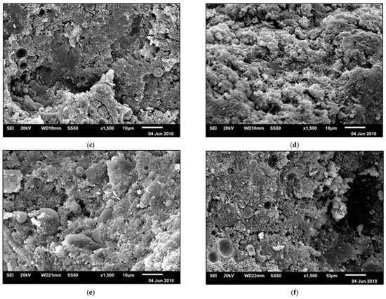 The highest compressive strength was obtained for the specimens with the lowest percentage replacement of Class F FA with HFFA (M-5-F/C). This is in line with the porosity/density results reported earlier and it is attributed to the fact that Class F FA contains significant amounts of silicates (Figure 1 and Figure 8), which induce improved internal cohesion to the composites, thus increasing their ultimate strength. In contrast, the porous nature of HFFA (Figure 8) leads to increased demands for water and hence lower compressive strengths. The reference mix design (PM) reached a uniaxial compressive strength of 50 MPa after 100 days of curing. This is generally lower than the strengths recorded for the rest of the mix designs, with the exception of M-15-F. In fact, the latter seems to be the only studied mix design affected negatively in terms of compressive strength by the grain size distribution of the HFFA. It is worth noting that, despite the differences in compressive strength noted, the Poisson’s ratio showed no significant alteration with the variation in the HFFA content and/or grain size distribution; the average value calculated by the recordings of the laterally and axially placed strain gauges on all composites was 0.2.