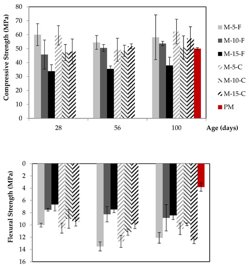 From the results reported in Figure 13 (bottom), it appears that the average ultimate flexural strength after 100 days of curing varied from 8.25 to 12.5 MPa. This is in all cases significantly higher than the respective value reported for the reference mixture (PM). The improvement in flexural strength with FA addition is in line with results reported elsewhere [59,60] and is attributed to the fact that FA changes the matrix chemical composition. The compressive strength (fc) for all samples investigated is also plotted in Figure 13 (top). The values reported at each curing age were calculated as the average of the maximum load sustained by the three specimens tested divided by their cross-sectional area.