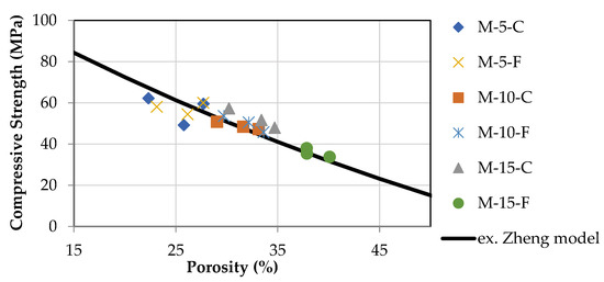 In Figure 14, the mean compressive strength from each mixture is plotted against the open porosity. The symbols refer to the experimental data, while the solid line is the extended Zheng model proposed by Chen et al. [61]. The theoretical relation between strength and porosity is given by a simple formula with only two parameters that define the strength characteristics of cement mortar, i.e., the compressive strength of the pore-free material (σo) and the percolation porosity at failure (pc).