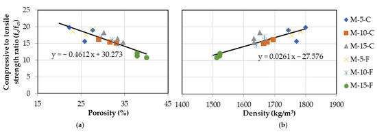 Comparing the compressive to tensile strength ratio to the open porosity and bulk density of the mixtures under investigation (Figure 15a,b, respectively) gives a linear relationship, with the ratio decreasing with increasing porosity and increasing with increasing density, as expected. This linear relation is in agreement with previous experimental research [62]. The ratio of compressive to tensile strength estimated here seems to take values greater than those for normal concrete (fc/ft,cr ≈ 10), mainly due to the self-compacting properties of the mixtures tested that generally lead to a denser microstructure and increased compressive strength.
