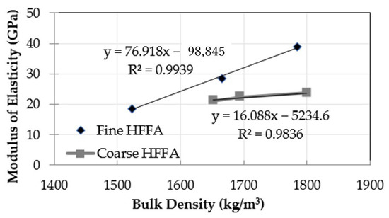 Finally, in Figure 16, the modulus of elasticity of all composites after 100 days of curing is plotted against their bulk densities. The results indicate that the modulus of elasticity increases with the bulk density of the hardened composite, irrespective of the grain size distribution of HFFA. Nevertheless, this increase is more profound in the case of the finer HFFA (d < 300 μm); this is in line with the compressive/flexural strength results (Figure 13). The lowest modulus of elasticity has been recorded for sample M-15-F; this is the sample with the lowest bulk density and highest porosity (Figure 7), which has shown intense cracking under SEM (Figure 9 and Figure 12).