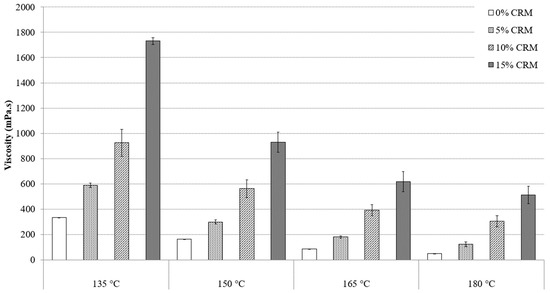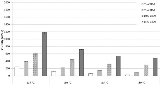 The changes in viscosity values were statistically compared as a result of the processed oil content and the different contents of CRM at a certain temperature range. The significance of changes was observed due to the temperature changes, based on changes in processed oil contents and CRM content changes. Table 4 and Table 5 illustrate the significance of the changes.