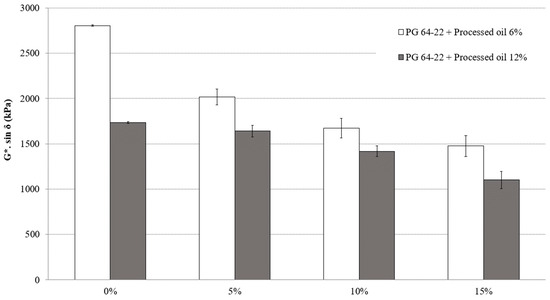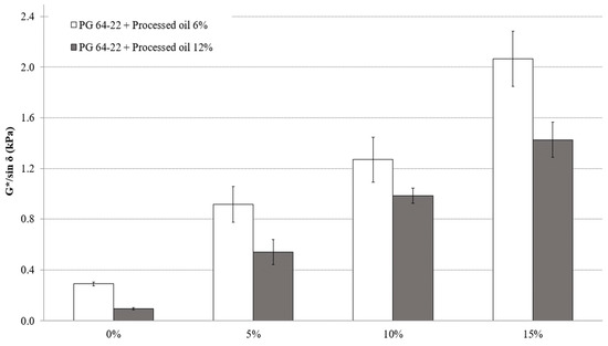 The rheological properties of asphalt binders were carried out by measuring the complex shear modulus (G*) and sine of the phase angle (δ) at 82 °C for every sample and calculating G*/sin δ accordingly. Fatigue cracking was evaluated by measuring G* and sin δ at 25 °C, and calculating G*sin δ. Three samples per content of processed oil and CRM were tested to have an average of measurements.