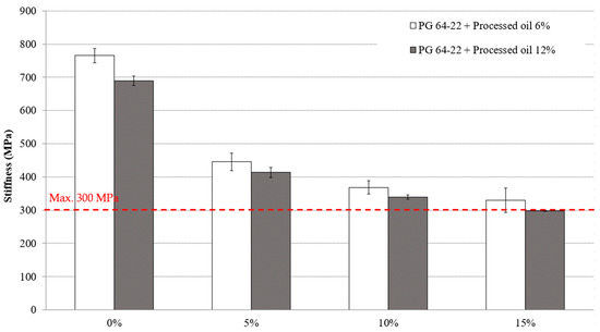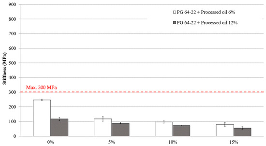 The effects of various CRM contents on the stiffness of RTFO + PAV aged PG 64-22 binder modified with 6% and 12% processed oil at −24 °C.