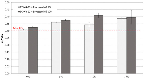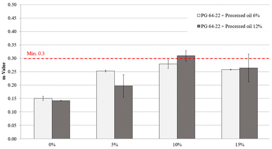 Effect of CRM content on m-value of processed oil-modified and long-term aged PG 64-22 binder aged at −12 °C.