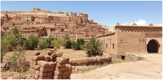 Earth was used as a building material by all ancient cultures, from simple dwellings to religious settlements and temples. It is a building material as old as humankind itself: having been used on all continents, it has a universal character. Earthen constructions have been known for over 9000 years. For example, houses made of adobe, built between 8000 and 6000 BC, were discovered in a region of the former Soviet Union; the Great Wall of China, which is approximately 4000 years old, was initially built of adobe and was later covered with bricks and stones; the city of Ouarzazate (Figure 1) in the Draa Valley, Morocco, is approximately 250 years old and is still occupied today [2]. The use of raw earth material has served not only for the construction of rural and urban settlements but also to erect of some of the most valuable and interesting monuments and architectural ensembles in the world, such as the Great Mosque of Djenne in central Mali. With a prayer hall that can hold up to 3000 people, this UNESCO World Heritage site rises almost 20 m high and is equipped with three separate minarets and hundreds of palm trees called “toron” that project from its façade for support and to facilitate plastering in an annual ceremony of rendition [9,10]. It is also noted that almost all African mosques are built with earth. Furthermore, the ancient city of Shibam, Yemen, one of the cities built with earth, is classified as a world heritage site by UNESCO [11,12].