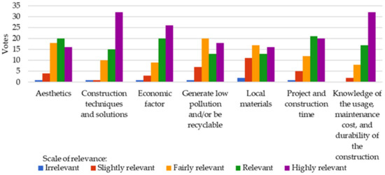 The interviewees were asked about the factors that motivated them to choose a particular construction technique for their projects or designs. They identified durability, maintenance costs, construction techniques and solutions as equally highly relevant factors, followed by the economic factor in second place. Caution with respect to the project and construction time and aesthetic considerations were also considered relevant. In contrast, the use of local materials and low pollution generation/recyclable materials were deemed slightly less important (Figure 2).