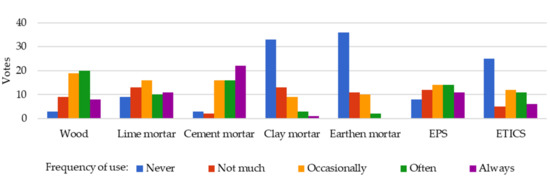 The interviewees were also asked about the importance of using sustainable construction practices. Almost half of them (49.2%) stated that having sustainable priorities when designing a new development or rehabilitating an existing one was of extreme importance. Another significant proportion considered it relevant (28.9%), and the remaining proportion considered it to be of medium or low importance. Regarding building rehabilitation, the survey also inquired about the prevalent construction materials, providing options such as conventional and natural/sustainable materials. The findings indicated that earthen and clay mortars, and the External Thermal Insulation Composite System (ETICS) were not commonly utilized options, whereas drywall and cement mortar were the preferred choices among professionals. Medium-relevance alternatives included expanded polystyrene (EPS), lime mortar, and wood (Figure 3).