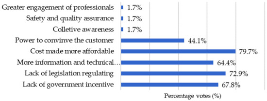 The survey also aimed to identify the challenges faced by professionals in the market, including qualified labour, materials, or equipment for sustainable and natural construction. Interviewees were asked about the main factors that hinder their use of sustainable construction techniques in their projects or works. Finding materials and specialized labour was identified as the most challenging factor, followed by cost and a lack of customer interest. A lack of knowledge, preference for market trends, design, and finish were ranked third, fourth, and fifth, respectively. Only one respondent commented that none of the options would impede choosing a sustainable practice, highlighting the priority of sustainability in the industry. When asked about what they considered lacking for a building to become more sustainable, the cost factor was the main concern, followed by the lack of government incentives and regulatory legislation for sustainable decision making. The need for more information and knowledge about sustainable materials and techniques was also highlighted, as was the importance of convincing clients. Other factors mentioned by participants included the need for collective awareness, safety and guarantees of work, and the increased involvement of colleagues in proposing sustainable solutions to clients (Figure 5).
