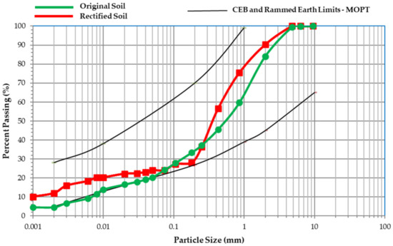 The soil used in this study was obtained from the Minho region in Portugal and was characterised through field and laboratory tests. In the first contact, observation, and field tests, it was possible to notice that it had a very rough and sandy characteristic. With little plasticity, the soil presented a need for correction with clay particles to become more propitious for earthen construction experiments, and 8% kaolin was added to facilitate this process. The granulometric curves of the original soil and the soil with the addition of kaolin can be observed in Figure 6 and are within the ideal parameters for useful soil in construction [22]. A granulometric analysis of the soil by sedimentation was carried out based on the LNEC E-196 standard [23]. The study used a clear, yellowish kaolin which was washed with a hydrocyclone and dried at the factory. According to data provided by the company Mibal, kaolin has a density that varies between 2.4 and 2.7 g/cm3 and a fineness that is essentially between 2 and 30 μm. To reduce the shrinkage content, the soil used for producing the RE specimens was supplemented with 40% fine gravel (up to 10 mm).