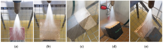 The sample was subjected to a flow rate of 14.26 litres/min and a water outlet pressure at the nozzle of 45 kPa, which is consistent with the pressure values for erosion tests referenced in international standards [32], see also Figure 8. The results were analysed after three cycles, and the mass losses and changes in the water volume of the specimens were verified. The mass variation was checked at the end of each cycle, and the ratio between the mass of the specimen after the first and third cycles was used to evaluate the change in mass of the specimens. The result was computed based on the NBR 13554 standard [33]. Following each rain simulation cycle to which the specimens were subjected, a visual evaluation was performed to document the changes.