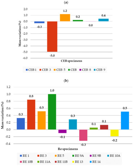 Mass variation: (a) CEB specimens; (b) RE specimens.