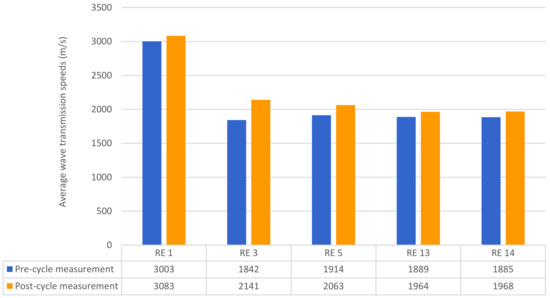As direct measurements of the specimens were made, the transducers were positioned face-to-face on opposite sides of the specimens, and each measurement was performed three times and then averaged. The readings were made before the durability tests and at the end of the cycles. The measuring distances are present in Table 2.