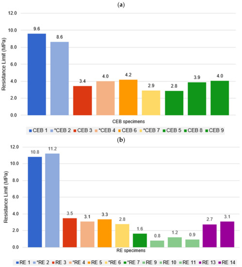 Compressive strength: (a) CEB specimens; (b) RE specimens (specimens marked with an asterisk were not tested for erosion).