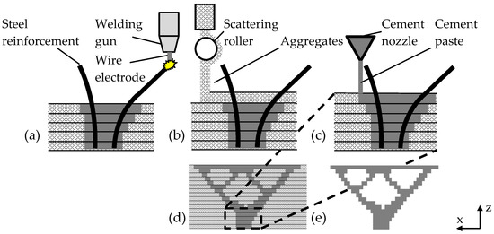 One method to address the challenge for the complete and automated integration of a steel reinforcement is to combine the selective paste intrusion (SPI) process with the wire arc additive manufacturing (WAAM) process, as shown in Figure 1. SPI is a particle-bed-based process where a cement paste is selectively applied on a layer of aggregates at the locations where the concrete structure is to be formed (Figure 1b,c) [4]. WAAM enables the production of steel components with a high degree of geometrical freedom by melting a steel wire with an electrical arc and depositing the molten metal layer by layer (Figure 1a) [5].