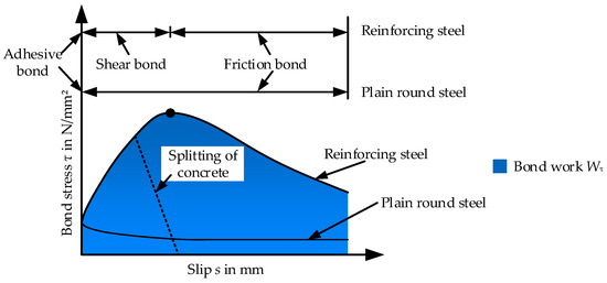 The source of the bond stress during testing [19] can be exemplarily divided into three characteristic mechanisms, which depend on the relative displacement s (in the following, also referred as “slip”) between the reinforcement and the concrete (see Figure 2):