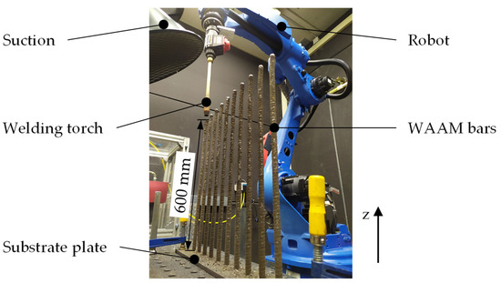The WAAM reinforcements were produced using the CMT cycle step process. A Fronius TPS400i (Fronius, Wels, Austria) was used as the welding power source. The position of the welding torch was manipulated by an industrial robot of the type Motoman MH24 (Yaskawa, Kitakyushu, Japan). A plate consisting of the mild steel S235JR was used as the substrate. Ten WAAM bars were manufactured simultaneously (see Figure 4) with a solid wire electrode made of G4Si1 in accordance with DIN EN ISO 14341 [30]. Each bar had a length of 600 mm to fulfill the requirements of the free length for the tensile tests [31] and the pull-out tests [19]. The specimens were used for tensile or pull-out testing. M21-ArC-18 was used as an inert gas in accordance with DIN EN ISO 14175 [32]. The stick-out was adaptively controlled and, if necessary, manually corrected every 200 mm of the printed height. A continuous strategy with a circular welding trajectory as used by Weger et al. [4] and described in Section 1.1.1 was deployed. The circular trajectories were welded with a welding speed of 0.25 m/min as listed in Table 1. The starting point of each layer was always chosen with an offset of 90° to the layer below. The bars were cut from the steel plate by an angle grinder after complete cooling. Table 1 shows the applied process parameters.