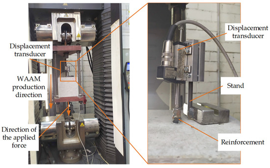 The tests were carried out in accordance with RILEM [19]. As shown in Figure 5, the specimens were placed vertically on a compression platen in the Zwick Z600. The tension force was then applied at the lower end (see Figure 5). As according to [19], for a ds of 12 mm, the loading rate was accordingly set to 72 N/s. In addition, the displacement transducer FWA025TR (Ahlborn, Germany) with a maximum resolution of 0.001 mm was used to record the slip. The console of the FWA025TR was mounted on a stand, which was glued to the concrete specimen with epoxy, and the tip was attached to the unloaded upper end of the reinforcement. For each specimen, the load was applied until reaching bond failure.