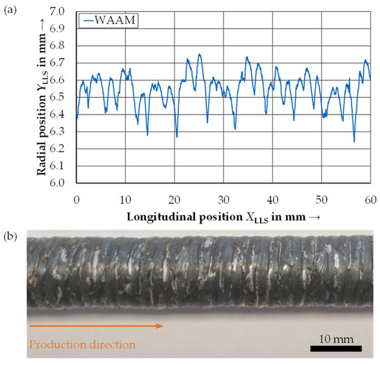 Result of one LLS of a WAAM specimen with an enlarged y-axis, (a) and picture of the surface quality (b) including the production direction (orange).
