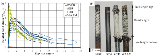 Five pull-out tests were carried out for each reinforcement type. One pull-out test of the WAAM series could not be evaluated due to negative slip values. It was assumed that the epoxy used as the glue to adhere the displacement transducer was not completely hardened, thereby leading to a negative slip due to shrinkage. For comparability, the bond stresses, calculated by Equation (1), were related to the splitting tensile strength fctm of the respective concrete series. Figure 7a shows the related bond stress-slip curves of all the specimens. All S355 specimens showed very low bond stresses due to their plain surface. After the adhesive bond was destroyed, only the friction bond remained. The GTR specimens showed the highest maximum bond stresses τmax with very low slip values at the same time. The reinforcing steel bars and the WAAM reinforcement displayed an almost similar behavior, with the maximum bond stresses tending to be slightly higher for the reinforcing steel bars. The inspection of the bond zone after testing revealed no conspicuities regarding an increased porosity. For all the reinforcement types (except S355), the sheared concrete consoles were visible (see Figure 7b).
