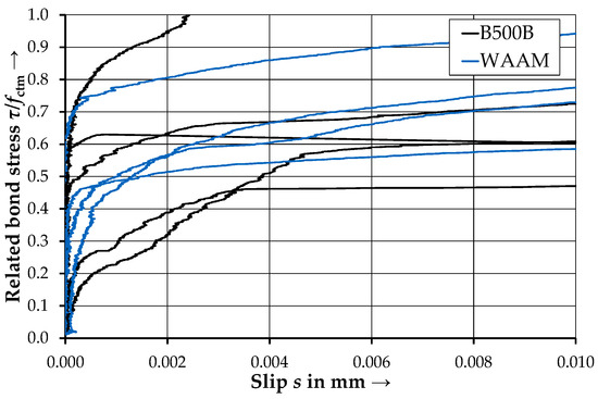 Figure 8 shows the bond stress-slip behavior of all the single WAAM and B500B specimens in the first 10 µm. For four out of five reinforcing steels of the type B500B, a substantial slip increase could be observed at or shortly after the destruction of the adhesive bond (forming an almost horizontal gradient in the bond stress-slip curve, as shown in Figure 8). In contrast, the transition for the WAAM reinforcement was found to be much smoother. After the destruction of the adhesive bond, the transverse ribs began to load the surrounding concrete. The interfacial transition zone (ITZ) between the steel and the concrete was deformed first. This zone is typically considered the weakest link due to its increased porosity [21]. It was assumed that the uniform and the regularly arranged transversal ribs of the reinforcing steel provide uniform stress transfer to the concrete along the entire bond length. A possible consequence of the uniform loading of the ITZ could therefore be a sudden failure. In contrast, the WAAM reinforcement was found to have a comparatively irregular surface. This probably led to a comparatively more irregular force insertion into the surrounding concrete. As a possible consequence, the ITZ gradually failed, depending on the load capacity of the respective area.