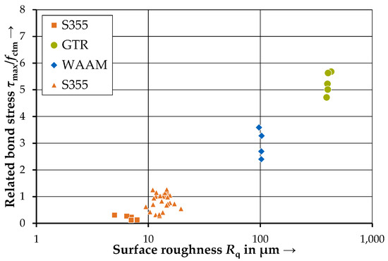 The surface roughness Rq was used to classify the bond behavior of the WAAM reinforcement in comparison to the S355 and the GTR samples. Figure 9 shows the related maximum bond stress τmax/fctm against the surface roughness Rq. With an increasing surface roughness Rq, higher maximum bond stresses were achieved. The results show a linear relationship across all three reinforcement types with a logarithmic scaling of the surface roughness. In [42], investigations were carried out on the bond behavior of plain S355 round bars with a different surface roughness (e.g., mill scale artificially roughened by sandblasting). Those results can be placed in the above-mentioned context.