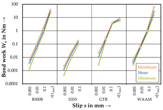 Figure 10 shows the bond work Wτ (calculated by Equation (2)) for the characteristic slip values s0.001, s0.01, s0.1, and s(τmax). The minimum, maximum, and mean values were depicted for each series. Both axes were logarithmically scaled, except for s(τmax). The value of s(τmax) was individually determined for every pull-out test. For better comparability, s(τmax) represents the slip value of all the maximum bond stresses shown in Figure 10.