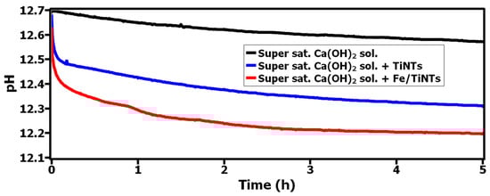 Note: The obtained different results from pH and conductivity for both TiNTs and Fe/TiNTs in supersaturated Ca(OH)2 can be explained. In the conductivity measurement, other ions are used for the mobility of conductivity; therefore, the difference in the pH is relatively small and not observable in comparison to the whole free ions. Therefore, the curves appear nearly identical. In the case of the pH measurement, the difference in pH is much more observable because it only deals with free OH− ions; thus, the influence of both TiNTs and Fe/TiNTs with supersaturated Ca(OH)2 solution is more noticeable. During the pH measurement, some carbonation possibly occurred. Therefore, curves are slightly lowered with time, as observed in Figure 1.