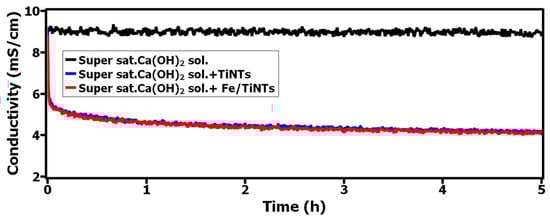 The conductivity measurement of saturated Ca(OH)2 solution in the presence and absence of both TiNTs and Fe/TiNT is shown in Figure 2. It was observed that both TiNTs and Fe/TiNT altered the ion concentration of supersaturated Ca(OH)2 solution. They lowered the concentration of free ions in the solution during the time measured.