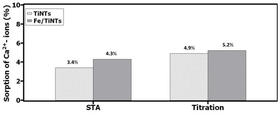 In both pH and conductivity measurement, the sorption of Ca2+-ions by TiNTs and Fe/TiNT resulted in those changes, and the amount of sorbed Ca2+-ions need to be determined [,]. Two methods were utilized to measure the amount of sorbed Ca2+-ions by nanotubes. Titration of the liquid part with EDTA and thermal analysis via STA measurement of the solid part, which was mentioned at the beginning of this section, and the respective results for both methods are shown in Figure 3. The revealed results from both the STA and titration analysis for the sorption of Ca2+-ions by nanotubes are nearly the same. As is seen, the amount of Ca2+-ions sorbed by Fe/TiNTs is higher in comparison to pure TiNTs.