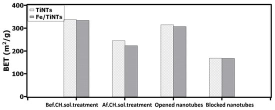 The BET specific surface area of both TiNTs and Fe/TiNTs before and after treatment with supersaturated Ca(OH)2 solution was measured by gas adsorption analysis, and the respective results are shown in Figure 4. As observed, the BET specific surface area of nanotubes was decreased after treatment with supersaturated Ca(OH)2 solution, and the effect was seen more in the presence of Fe/TiNTs. Figure 4 not only shows the BET specific surface area of nanotubes before and after Ca(OH)2 treatment, but it also shows models of two possible assumptions. According to the first assumption, it is assumed that the Ca2+-ions have not closed the nanotubes when they were treated with Ca(OH)2 solution, and the tubes remain open. In this case, it can be said that no sorption by nanotubes occurred. In the second assumption, it is assumed that Ca2+-ions closed the nanotubes during the Ca(OH)2 treatment; therefore, their BET specific surface area would be half of the value which they had before the Ca(OH)2 treatment. Thus, with gas adsorption, it is not possible to measure the surface of the blocked part.