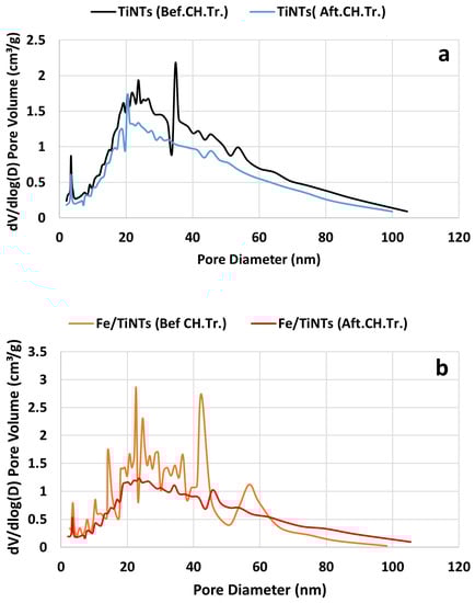 The BJH pore size distribution of TiNTs and Fe/TiNTs after and before treatment with supersaturated Ca(OH)2 solution are presented in Figure 5. As is observed, the pore volume was decreased after treatment with Ca(OH)2 solution. It means that sorption of some Ca2+-ions occurred by the nanotubes; they could be trapped in the inner and outer walls of the nanotubes as the decrease occurred in all ranges of diameter.