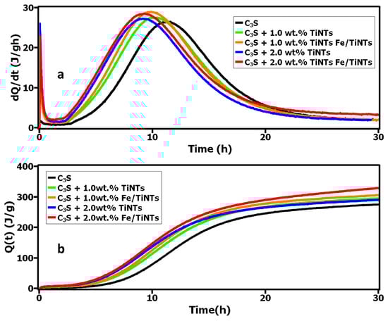 The heat evolution of C3S hydration was investigated via isothermal calorimetry. The heat evolution [dQ/dt(J/gh] and cumulative heat (J/g) during 30 h hydration of C3S in the presence and absence of both TiNTs and Fe/TiNTs with 1.00 and 2.00 wt.% in the binder are shown and displayed in Figure 6. The induction period of hydrated C3S was shortened in the presence of both Fe/TiNTs and TiNTs in comparison to the pure C3S (reference). The rate of heat evolution for the sample with 2.0% Fe/TiNTs still stayed higher after 30 h hydration, as is observed from Figure 6 (upper part). Additionally, the cumulative heat of hydration of C3S was increased for both samples, with respect to the reference. The increase in the cumulative heat evolution and a higher rate of heat evolution indicates that a higher amount of C3S reacted with water in the presence of TiNTs and Fe/TiNTs.