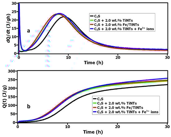 Furthermore, to better understand the effect of Fe/TiNTs on the hydration of C3S, an extra TiNTs sample was prepared with iron ion solution (Fe(NO3)3·9H2O) and used as a third reference. The third reference was used to check if there was no impact from the dissolved educt (Fe(NO3)3·9H2O) on the hydration of C3S and that the only effect was due to doping. The hydration process was monitored during a 30 h measurement, and an acceleration in the hydration of C3S was expected
