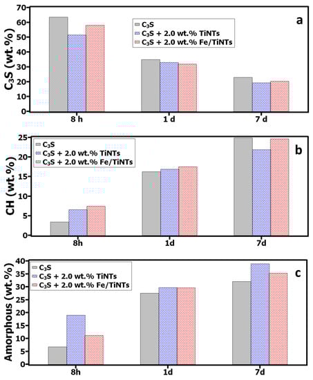On the basis of XRD results in combination with STA, the phase composition of hydrated C3S was determined and it is shown in Figure 8. As observed from Figure 8, the percentages of C3S residue for all hydrated samples containing TiNTs and Fe/TiNTs decreased compared to the pure C3S sample within the specified time. It should be noted that the amorphous phase here shows only C-S-H phases, and subtraction of CH content was already made from that with the help of revealed data from STA. The subtracted value was added to the crystalline value of CH, which had been determined by XRD. In terms of hydration, more hydration products (CH and C-S-H) were formed in the presence of nanotubes and it is in good agreement with the literature [].