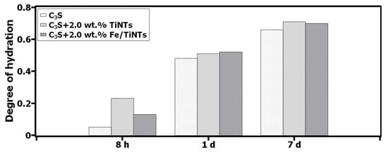As is observed (Figure 9), the degree of hydration for all samples containing nanotubes was increased compared to the pure hydrated C3S sample. Apart from the 8 h samples, 1 d hydrated samples were showing a similar effect, as revealed by DCA (Figure 6). It is difficult to observe a significant difference in the effects of TiNTs and Fe/TiNTs on the degree of hydration of 7 day samples.